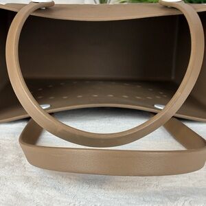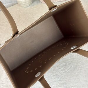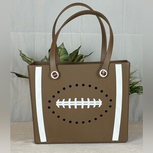 Get ready for game day with this adorable Celebrate It football-themed tote. Perfect for tailgating, carrying essentials, carrying groceries, or showing off your team spirit. Add charms to show off your team of choice. This bag is a must-have for any sports fan. Constructed of a durable plastic resin and wipes clean easily. In excellent condition with the exception of rubbing on a couple of "football" grommets on handles (see pics).