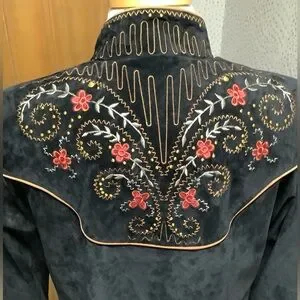 A beautifully embroidered black suede jacket never been warm. It has been sitting in the closet like a time capsule from the 90s. It would be beautiful with a sundress or a pair of blue jeans pants, or blue jeans skirt. Please ask if you have any questions.