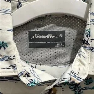 Tropical-themed shirt by Eddie Bauer. White base with blue and black patterns. Perfect for casual outings.