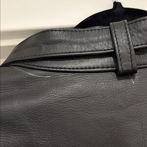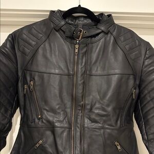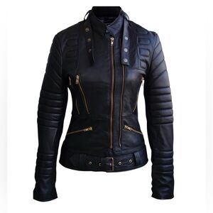 Designed & stitched to perfection. Attractive combo of smooth black leather w/ contrasting bronze enhance the appeal. Double bronze front zipper fastening & multiple zipped pockets are arranged vertically & horizontally to add to its chic style. Belted design showcases your figure. Get ready to turn heads in this fantastic piece of leather!