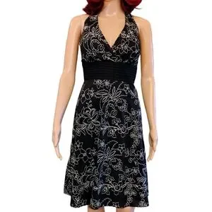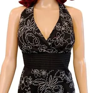 Delicately detailed white flowers on black background. Cumberbund style waistband. Very figure flattering. Excellent condition.