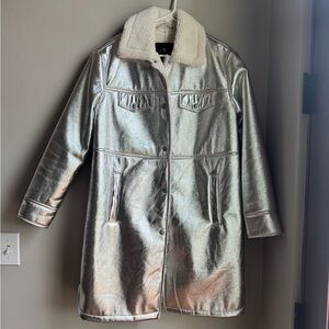 Statement silver metallic faux shearling coat with ultra-cozy teddy lining throughout. Features a snap-front closure, functional pockets, and a plush faux shearling collar for warmth and style. Longline silhouette gives major Y2K, spacecore, futuristic, sci-fi winter vibes.