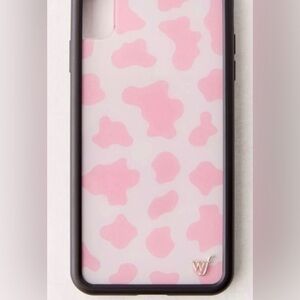 Rodeo vibes with this pink cow print phone case from Wildflower. Plastic case with rubber bumper edge and logo at bottom corner.