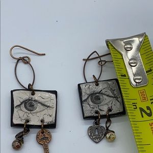 Unique earrings featuring an artistic eye design with charming key and heart pendants. Perfect for adding a touch of creativity to any outfit.