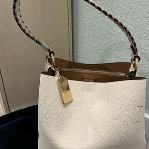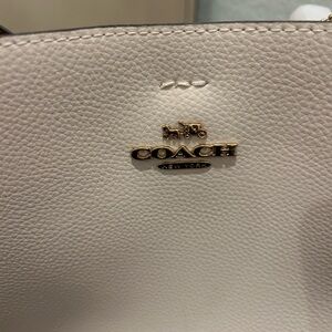 Chic Coach shoulder bag in cream leather. Features gold hardware and stylish strap design. Ideal for everyday use.