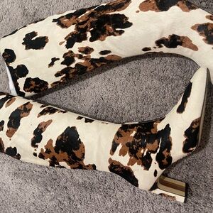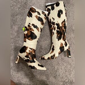 Stylish heeled boots with a bold black and brown pattern. Perfect for making a statement.. these works better for more slender feet and calves that are more on the slender side.