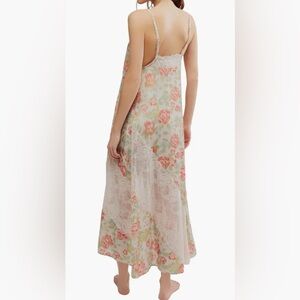 a silky floral fabrication with a lace neckline and inlays throughout.
