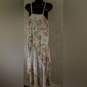 Silky floral fabrication, V-neckline with lace trim, skinny adjustable straps, picot trim, lace inlays throughout, high-low hem