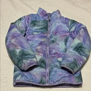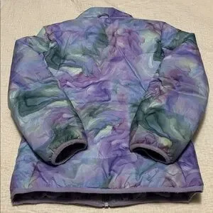 Stylish puffer jacket with a blend of purple and green hues. Ideal for keeping warm. Some piling on the fuzzy fabric at the cuffs & bottom but overall great preloved condition!