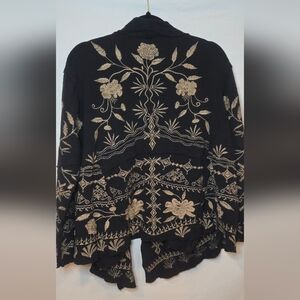 Elegant black cardigan with intricate beige embroidery. Perfect for layering.
