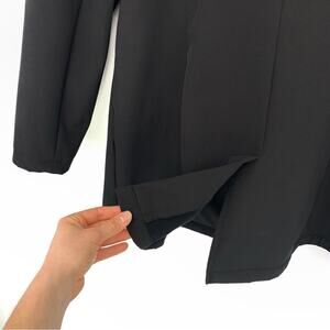 Free Country Softshell Parka Trench in black with grey trim. Collared neck, exterior button closure, zipper pockets. Fleece lined, zipper upper arm pocket. Older style, but in great condition!