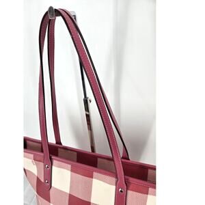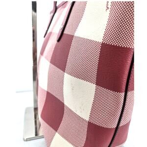 Elevate your style with this vibrant Coach City Zip Tote! Featuring a multi-pink plaid print on coated canvas with smooth leather accents, this tote is both eye-catching and durable.