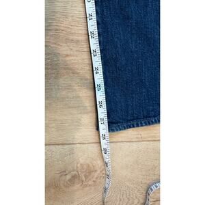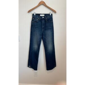 Mother Denim The Rambler Zip Matinee Ankle jeans in the “Let’s Wine About It” wash, women’s size 24, featuring a high-waisted fit with a wide straight leg, zip fly, and ankle-length inseam finished with a curved side seam hem for a distinctive, modern silhouette, crafted from semi-rigid denim in a classic blue hue with subtle fading and whiskering.