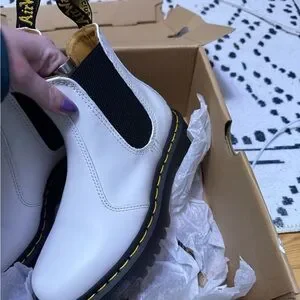 Sleek white leather with black elastic panels. Iconic yellow stitching. Durable and stylish.