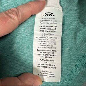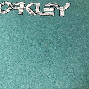 Stylish Oakley tee in a cool teal shade. Features bold logo design. Ideal for everyday wear. Has light stain on front as shown in photo.