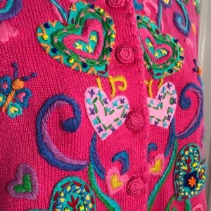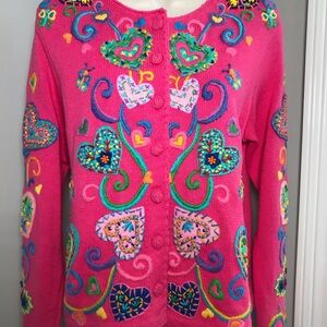 Michael Simon Long Sleeve Valentine’s Day Button Down Cardigan. Women’s Size Medium and Embellished with Embroidered and Beaded Multi Colored Hearts. So Cute! This is a rare hard to find cardigan.
