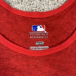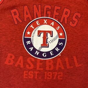This Texas Rangers shirt is a men's small sleeveless tank top in red, featuring the MLB team's logo. Officially licensed by Major League Baseball, this shirt is perfect for fans of the Texas Rangers looking to show their support during the regular season. Made by MLB Merchandise and manufactured in Honduras, this shirt is a stylish and comfortable option for any baseball enthusiast.