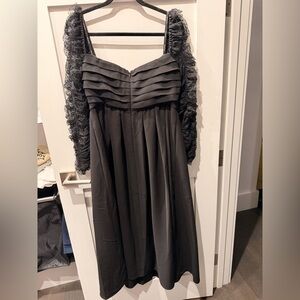 Featuring a square neckline, fitted pleated bodice, long frilled mesh sleeves with signature polka dot pattern, back zip closure, and a flared pleated midi skirt for graceful movement, this dress is as easy to wear as it is captivating. The structured-yet-flowy silhouette is surprisingly accommodating, offering generous room and beautiful support for a larger bust while preserving that signature self-portrait sophistication.