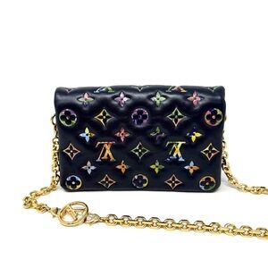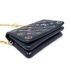 Description: This is a Limited Edition Louis Vuitton LV Garden Pochette Coussin Navy Embossed Multicolor Monogram. This crossbody bag is crafted of navy blue puffy lambskin, monogram embossed with a multicolor floral print and gold hardware. The flap opens to an interior with a zipper pocket and a leather patch pocket.
