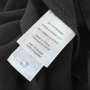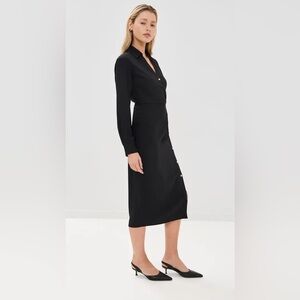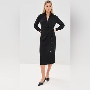 Crafted from mid-weight, non-stretch crepe, it includes a gold-tone button placket, long sleeves with buttoned cuffs, and a hidden side zip for a clean finish. Unlined and designed to hit at or just below the mid-calf—perfect for work, events, or elevated everyday wear.