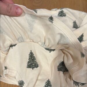 Adorable cream bodysuit with green tree pattern. Features long sleeves and ruffled skirt. Perfect for any occasion.