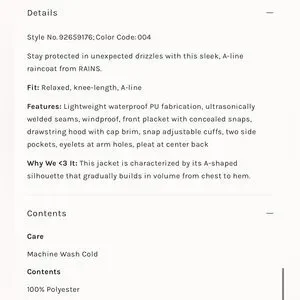 NWT Rains x Free People A-Line Jacket Waterproof Rain Coat Lightweight