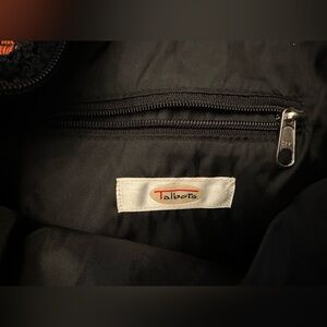 Chic and versatile Talbots black crochet shoulder bag featuring a beautifully textured hand-crocheted knit exterior with a sleek black fabric lining and zip closure. This bag blends classic Talbots quality with a modern boho aesthetic — perfect for spring and summer styling.