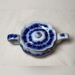 The Vintage Vinranka Gefle Sweden Flow Blue & White Rare Teapot is a stunning piece of decorative cookware that is handmade and features a round shape. Made of porcelain using pottery production technique, this teapot has a glossy finish and is adorned with a beautiful blue and white color scheme. With its original design and vintage appeal, this teapot adds an elegant touch to any table setting. To preserve its beauty, please refer to the care instructions of hand washing only. There are a few spots on the teapot as seen in photos. The teapot is 9 1/2” long and 4 1/2” high.