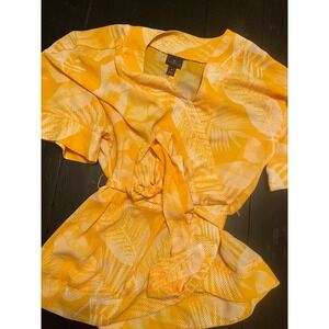 Keywords: Worthington top, wrap shirt, tropical print, leaf pattern, yellow blouse, women's fashion, summer wear, resort wear, casual top, vacation style, tie waist, feminine