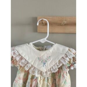 80s/90s vintage floral romper with ruffled collar and embroidered detail on the bib area.