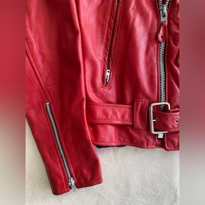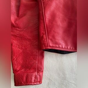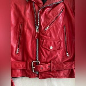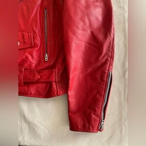 Elevate your style with this vibrant red leather motorcycle jacket. Designed for a bold and confident look, it's perfect for any occasion. Heavy leather and hardware, a quality made garment. In good used condition with minimal signs of wear. Heavy Zipper closure, front pockets, tailored fit.