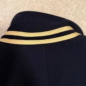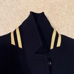 Size 6 (US) which is a UK size 10. Navy blue with gold detail behind the collar.