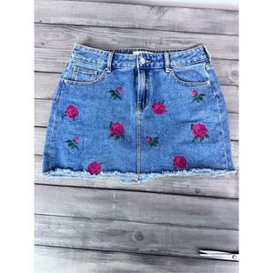 Pacsun Red Rose Embroidered Denim Jean Mini Skirt Raw Hem Size 28 Y2K
