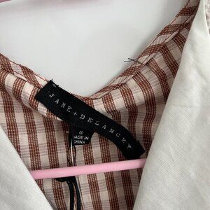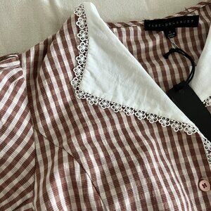 This is a very unique, almost vintage style dress. Puff sleeves and a very delicate flower lace detail collar. I wanted it so badly to work for me but the length is not normally something I go for. The pattern is like a pinkish brown check. Skirt is lined, it is not see through. Brand new with tags.