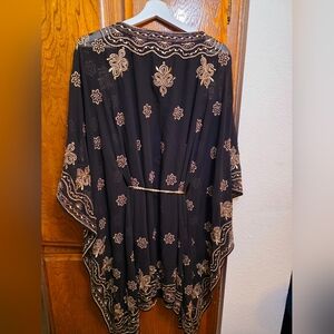 The ornate beadwork on this mini off-white kaftan dress is truly breathtaking. Cut from a semi-sheer fabric in a handkerchief shape, it drapes the body beautifully and has dramatic, waterfall sleeves. A braided self-tie belt gives your frame definition. Intricately embroidered throughout, it’s great for special celebrations or just a beachside dinner on your next vacation.