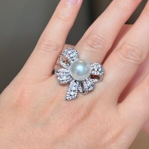 Chic silver ring with a large pearl centerpiece. Features a sparkling bow design. Ideal for elegant occasions.
