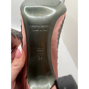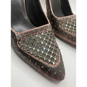 These pre-owned (try on wear only)Alberta Ferretti limited edition heels, size 39 (US 8.5), feature a pointed toe and stiletto heel. The shoes are primarily pink with gray accents and a dark gray interior. The toe area is embellished with a mesh overlay and small, reflective beads arranged in a grid pattern, framed by a fringe-like texture. The heels are made in Italy from "Vero Cuoio" (genuine leather) and show minor wear on the soles and heel tips.