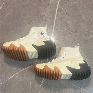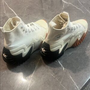 The Unique high-top Run Star Motion takes the classic Converse DNA and pairs it with ultra-modern, innovative, abstract design with bold sole. Features white upper and black accent with contrasting brown gum sole.
