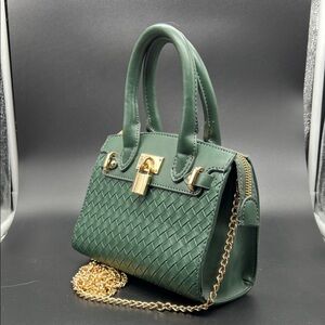 Chic green leather Kelly bag satchel with woven texture. Features gold lock and chain. Stylish and versatile. Incredible details! Measures 7.25” wide and 5.5” high plus 4” handles. Gold chain strap. 49.5” total length chain (so hangs 25”) please review photos for condition ask any questions!