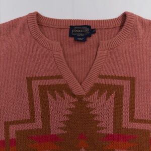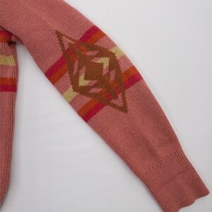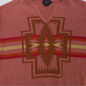 Classic Pendleton knit sweater featuring a bold Southwest-inspired geometric pattern. Beautiful dusty rose base with warm earth-tone accents and a flattering v-neckline. High-quality cotton knit with cozy structure—perfect for fall layering, western-inspired outfits, or elevated casual wear.