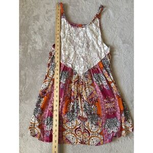 A charming Free People Intimately dress, perfect for adding a touch of bohemian flair to your wardrobe. This sleeveless dress features a unique design with a delicate lace bodice and a vibrant, patterned skirt in shades of pink, orange, and white. The relaxed fit and lightweight fabric make it comfortable and easy to wear. This dress is ideal for casual outings, summer festivals, or a relaxed day at the beach.