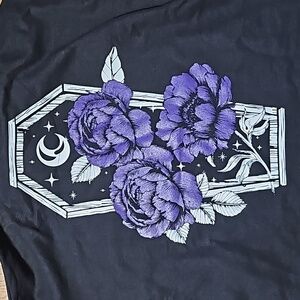 Hot Topic floral hoodie with white casket and purple rose flowers. Moon and star print on one sleeve. Crop top style with raw hem. Size small. NWT in original packaging.
