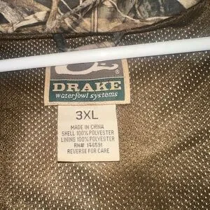 Drake Waterfowl Systems camo hooded hunting shell jacket in size 3XL. Designed for waterfowl hunting and outdoor use. Features water-resistant outer shell, reinforced sleeves for durability, attached hood, and multiple zip pockets. Quiet fabric—perfect for duck & goose hunting.