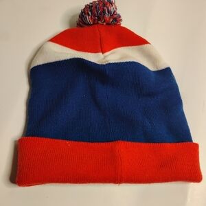 Vibrant beanie with Indianapolis Monumental Marathon logo. Features bold red, white, and blue stripes with a pom-pom on top.