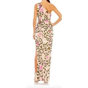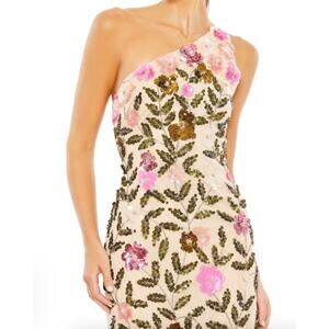 Mac Duggal 10903 nude multicolor evening gown features floral sequin beadwork on its fitted silhouette, back zip, one-shoulder neckline, and side slit. Excellent condition. Some sequins have come off from normal wear. Size 4. Chest 17", Waist 15.5". Hips 17", Length 60"