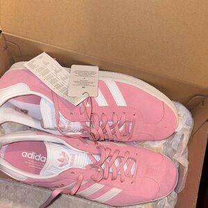 Chic adidas Gazelle sneakers. Soft pink with crisp white details. Perfect for everyday wear.