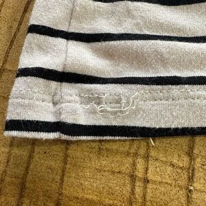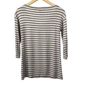 Pullover style. Deep v-neckline. 3/4 sleeves. Metallic stud butterfly embellishment. Cream with black stripes. Super soft material. Stretch material. No fabric tag, but it feels like a cotton/spandex blend. Casual. Everyday. Soft. Versatile. Resort. Coastal. A