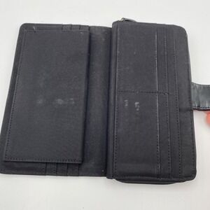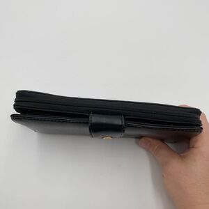 Aigner black leather wallet organizer with snap closure and zip-around compartment. This functional accessory boasts multiple card slots, bill compartments, and a clear ID window, offering ample space for your essentials. Perfect for daily organization or travel.