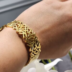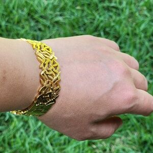 This stunning gold leaf bracelet adds a touch of elegance to any outfit. Perfect for any occasion.