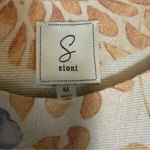 Size medium Sioni knit floral sweater. Oatmeal base with blue and light rust pattern. Blend of rayon, polyester, and nylon. Round neck and curved hem. No shoulder seam; relaxed dolman-style sleeve shape.